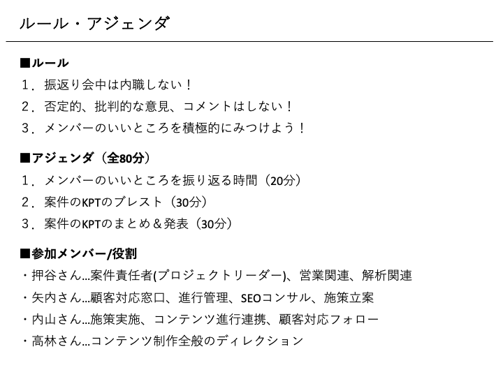 最初のパートは、メンバーのいいところを振返る時間。いきなり課題の洗い出しやブレストから始めてしまうと、個人へのダメ出しやフィードバックになってしまう可能性があるので「メンバーのいいところの振り返り」からスタートします。それによって実りあるディスカッションが可能となります。
