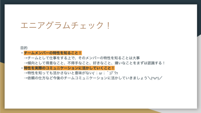 エニアグラム診断を行う目的は以下のスライドの通り。