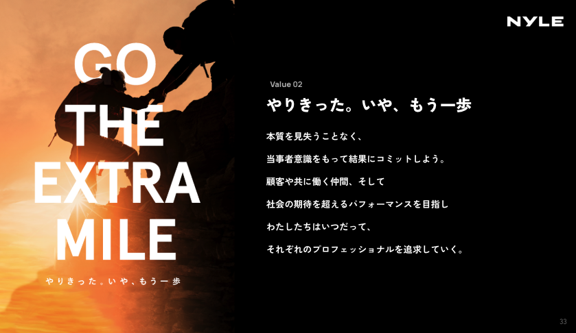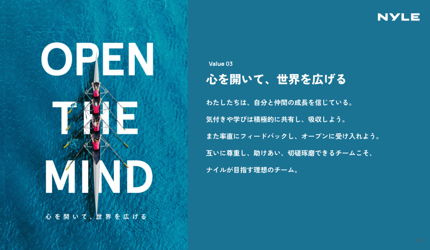 宮野:ナイルが大切にしているカルチャーは、ミッションやビジョンを実現するために社員一人ひとりが大事にしている3つの行動指針(バリュー)に集約されます。