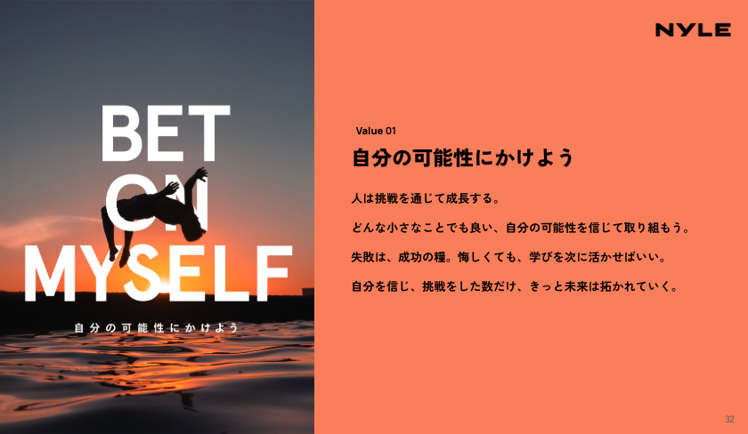例えば「BET ON MYSELF」は、自分で決断して挑戦することを尊重するナイルの風土を象徴しています。若手でも手を挙げれば大きな裁量を任され、そこで得た経験が次の挑戦につながる循環があります。