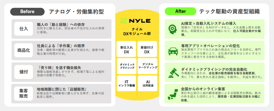 その成功モデルを、次のM&Aなどを通じて横展開していく――それが結果的にナイルが掲げる中古車業界全体のDX化につながると信じています。